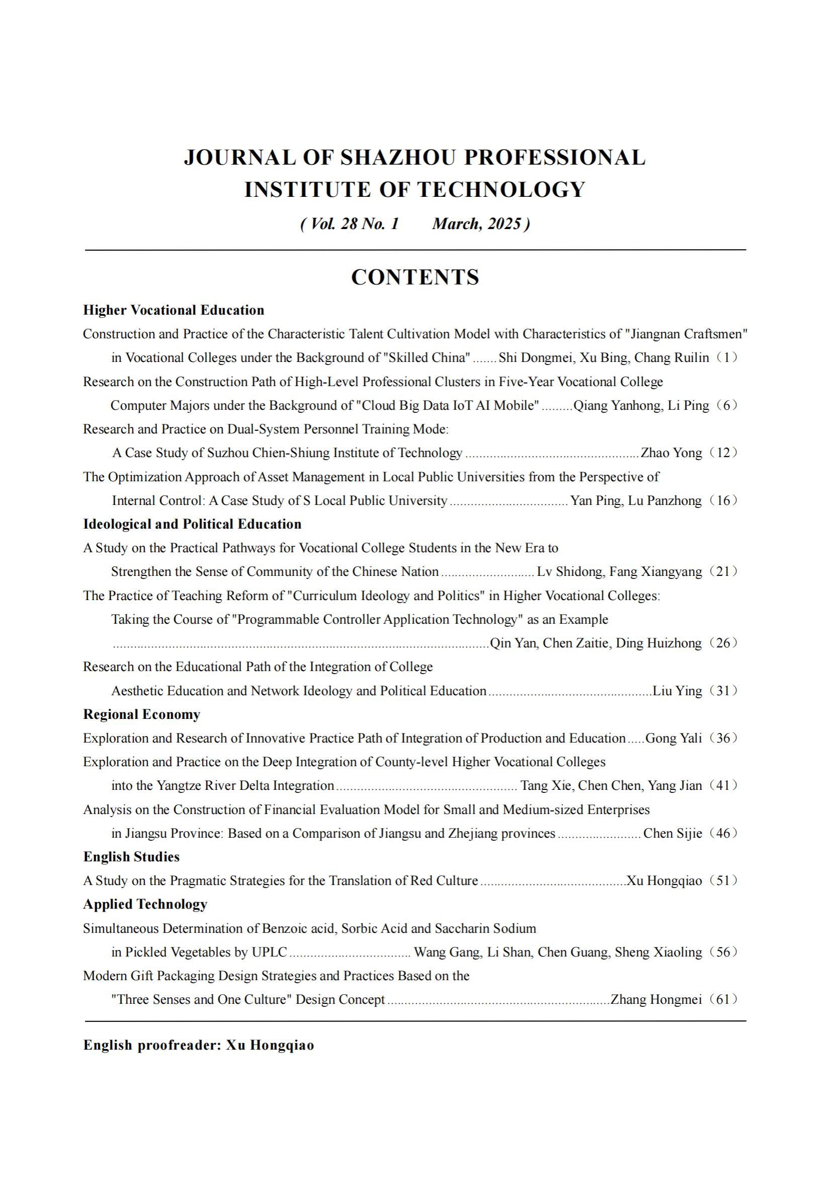 《沙洲职业工学院学报》2025年第28卷1期目次
